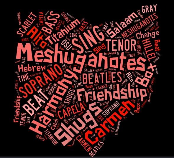 MeshugaNotes, fondly known as "Shugs," have been a student-run organization affiliated with OSU Hillel since 1999. They rehearse twice a week and travel throughout Ohio and the Midwest for performances. The MeshugaNotes sing OSU spirit songs, oldies, and current radio music, as well as classic and contemporary Hebrew songs. Everything that they sing has been arranged by current or past MeshugaNotes members.